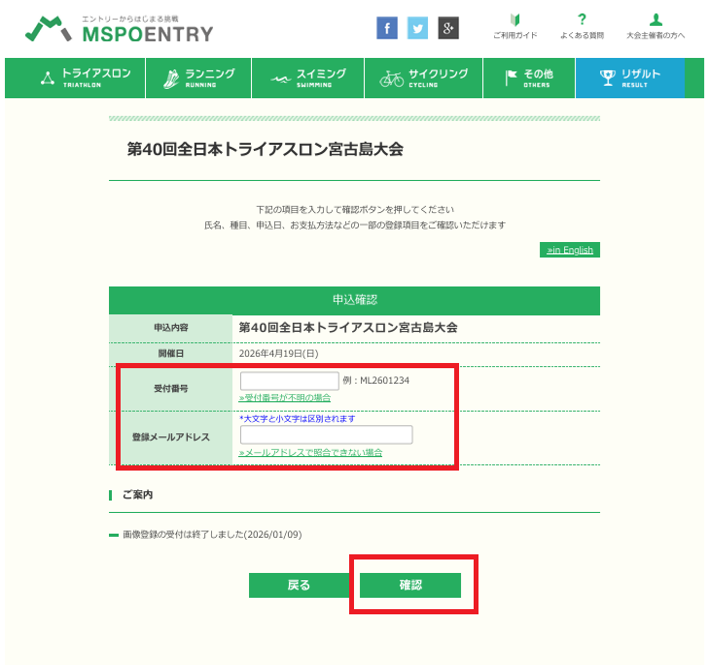 ①上記URLより(MLから始まる)受付番号と申込時に登録したメールアドレスを入力し確認ボタン
