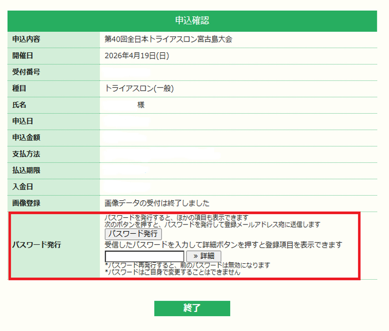 エムスポエントリーサイトの申込確認画面からもご自身のレースナンバーの確認が可能です。
