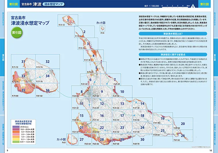 宮古島市防災マップは、災害時に避難したり、命を守る行動を考えるために役立つ情報をまとめたものです。